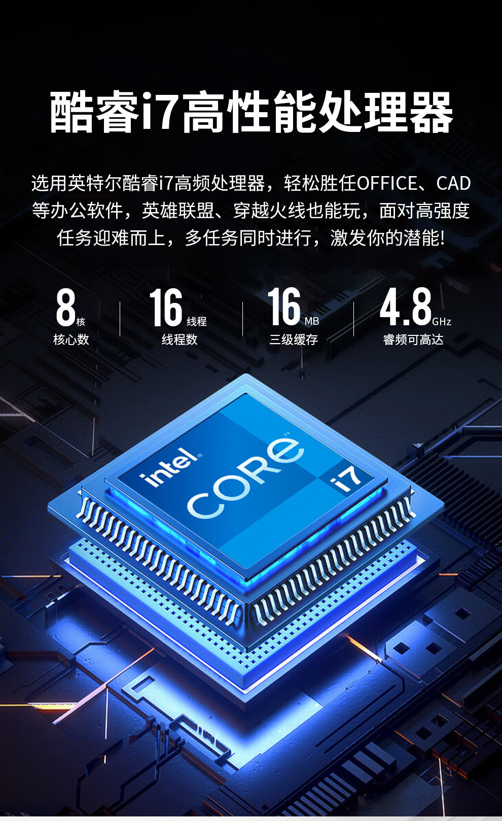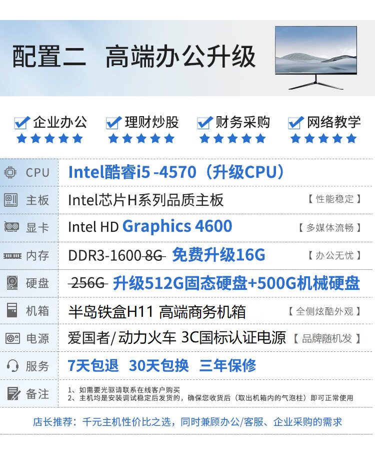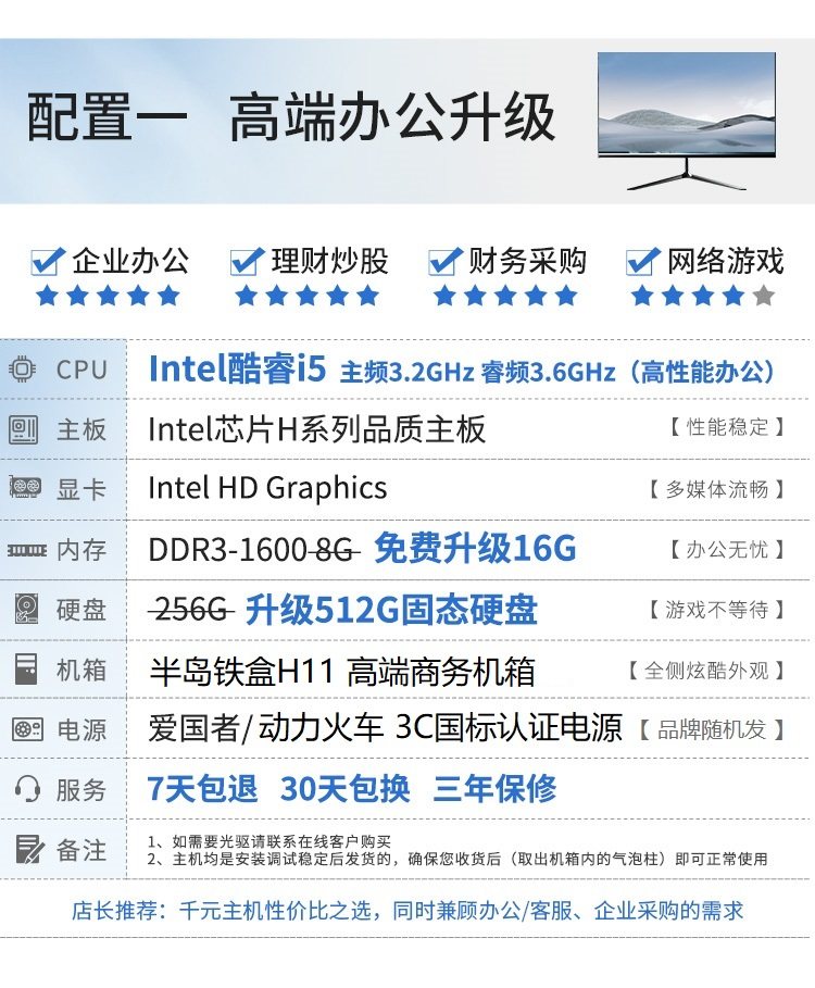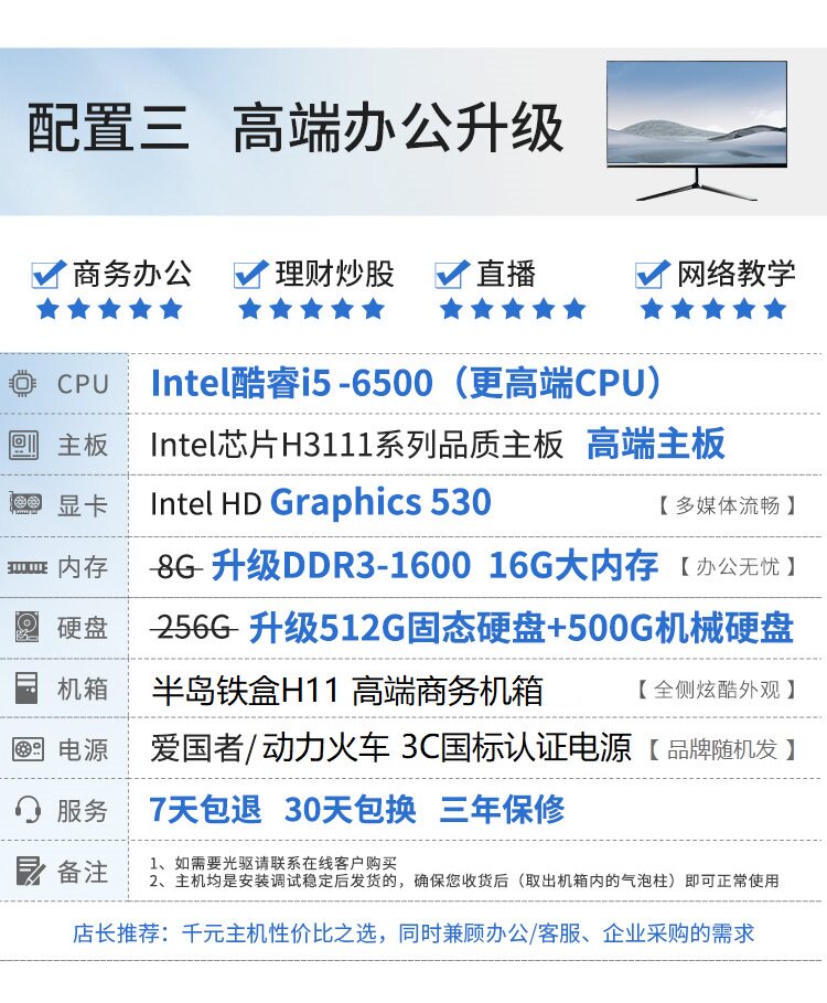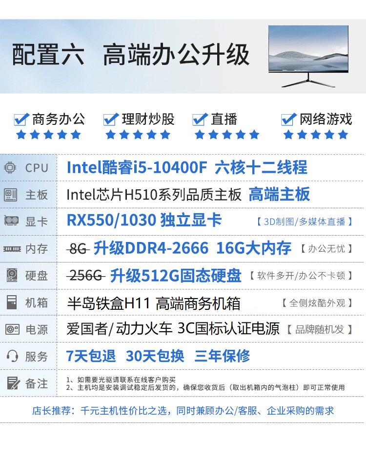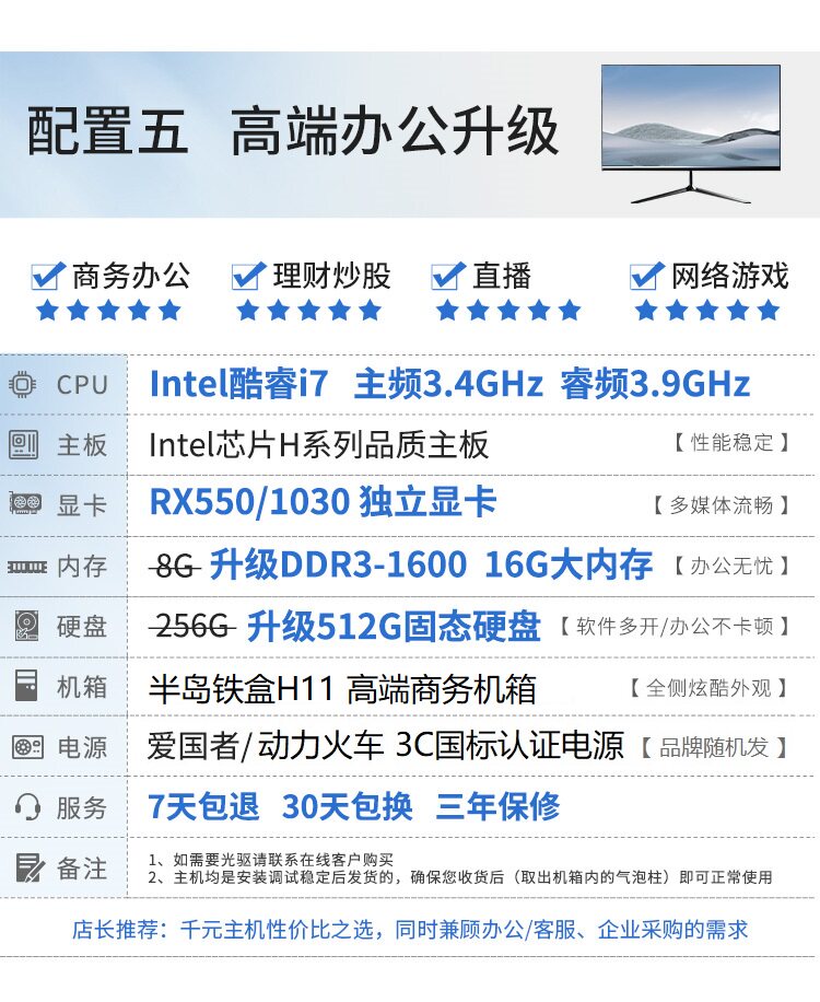 英特尔台式电脑i5/i7/16G/512G家用电脑办公组装机电脑主机全套